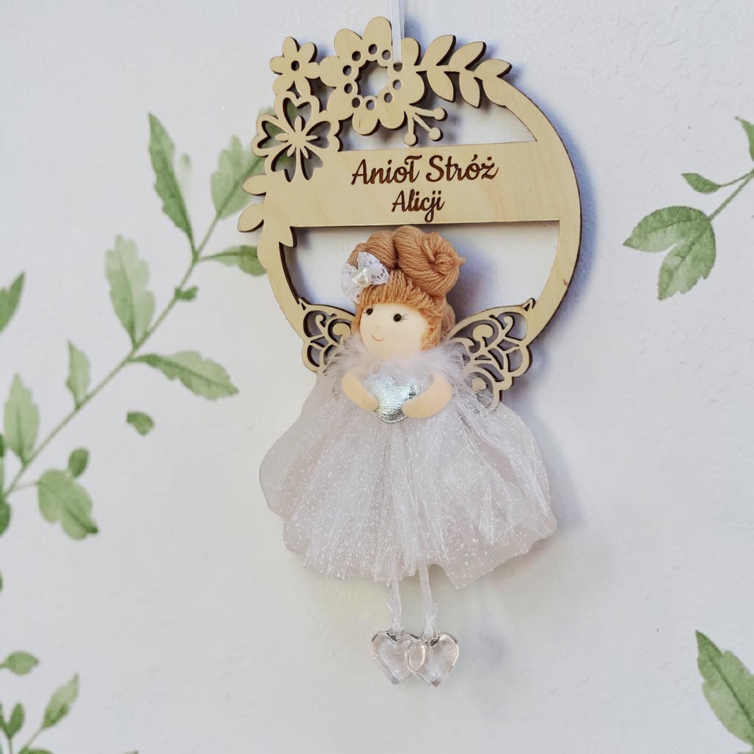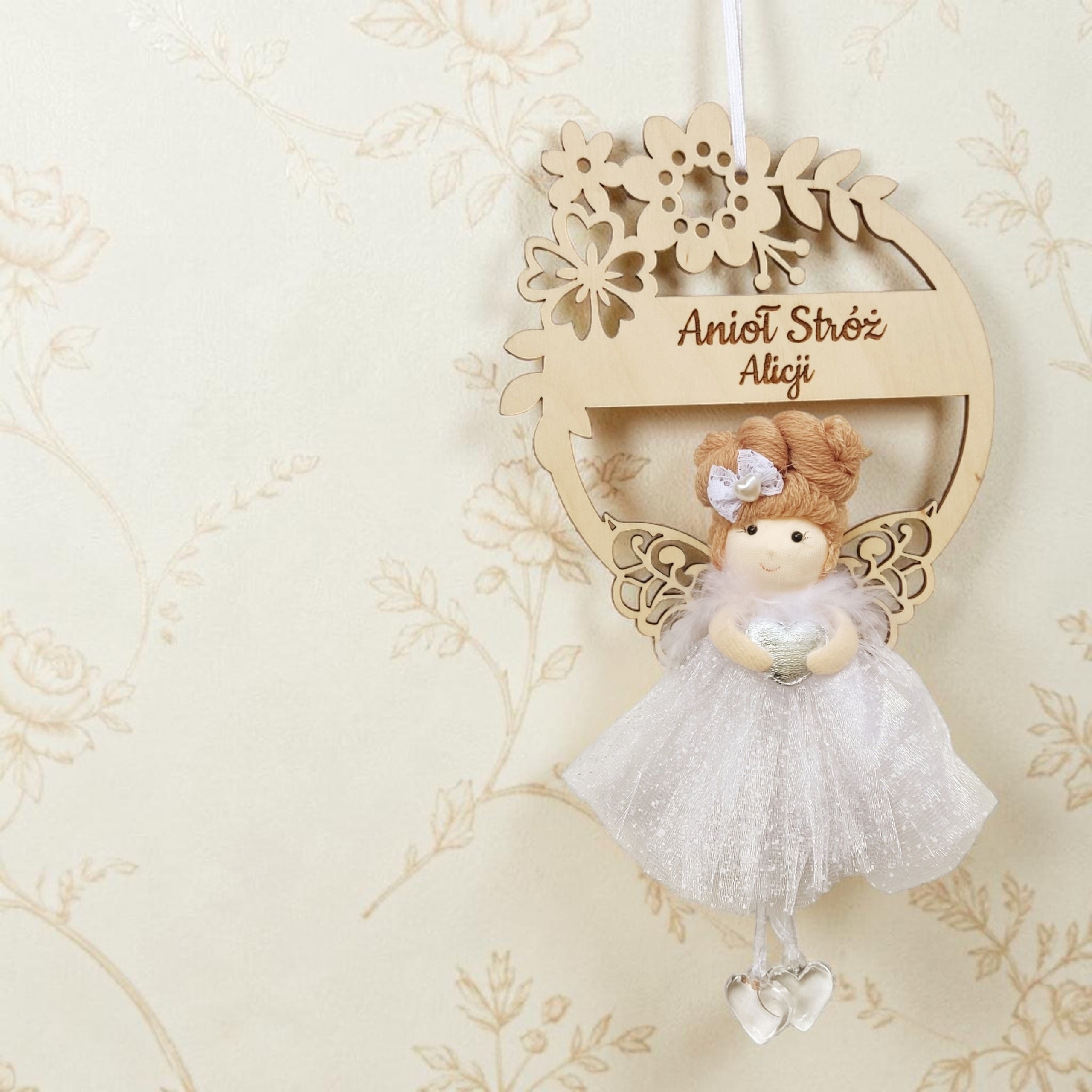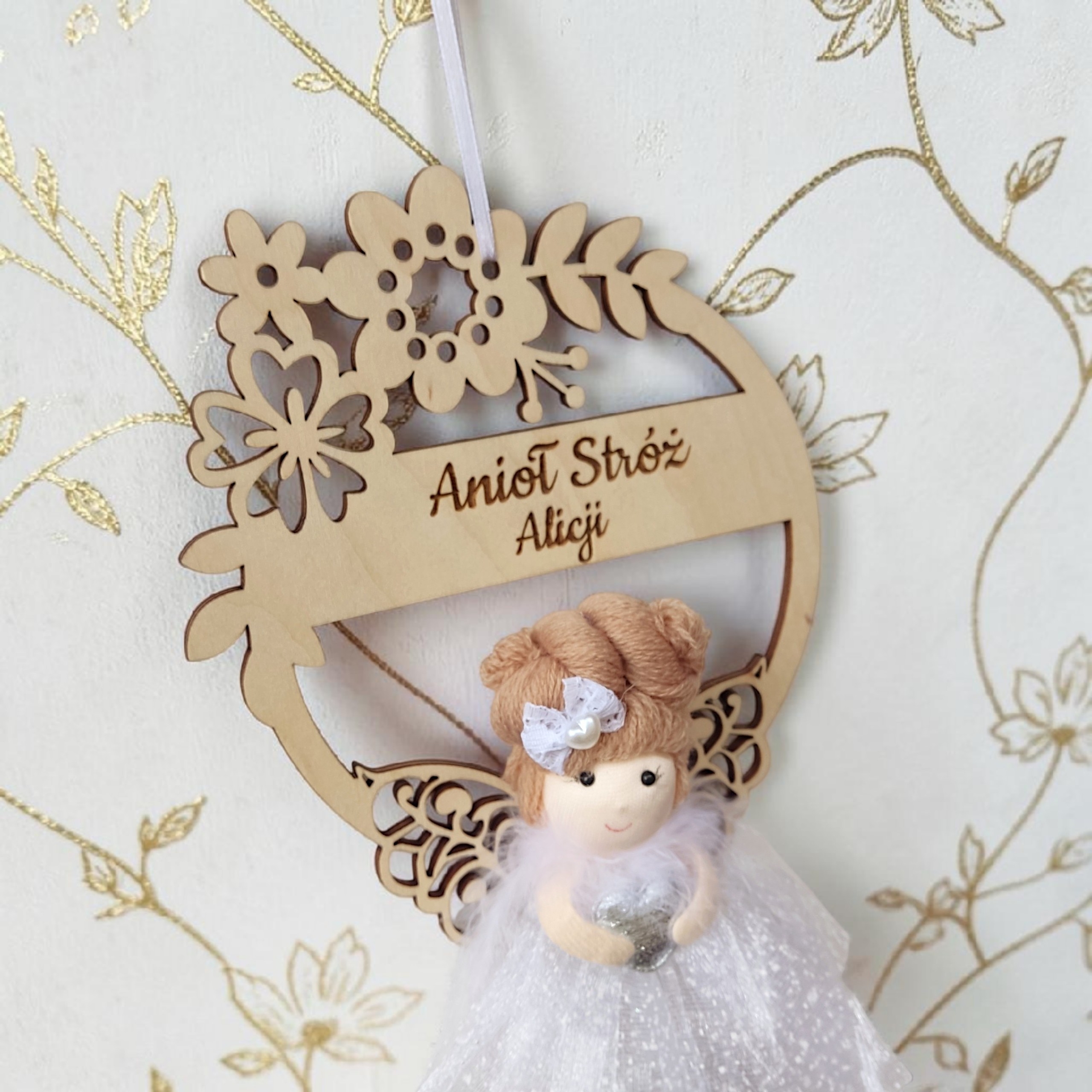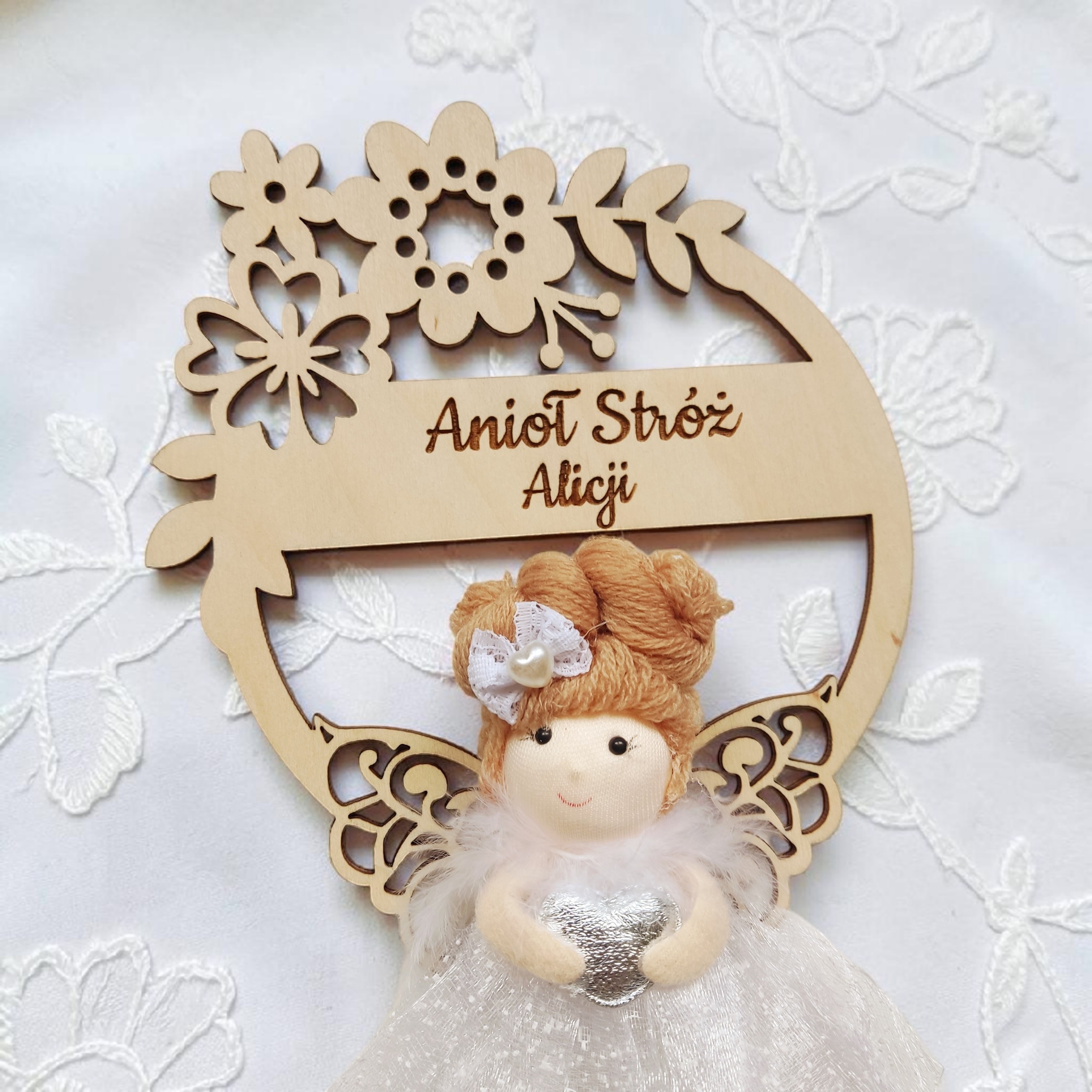 Delikatny aniołek w eleganckiej, tiulowej sukience został umieszczony na ozdobnym wianku kwiatowym, starannie wyciętym ze sklejki. Całość tworzy subtelną i niezwykle estetyczną kompozycję, która doskonale sprawdzi się jako dekoracja pokoju dziecięcego oraz sentymentalna pamiątka na lata.
