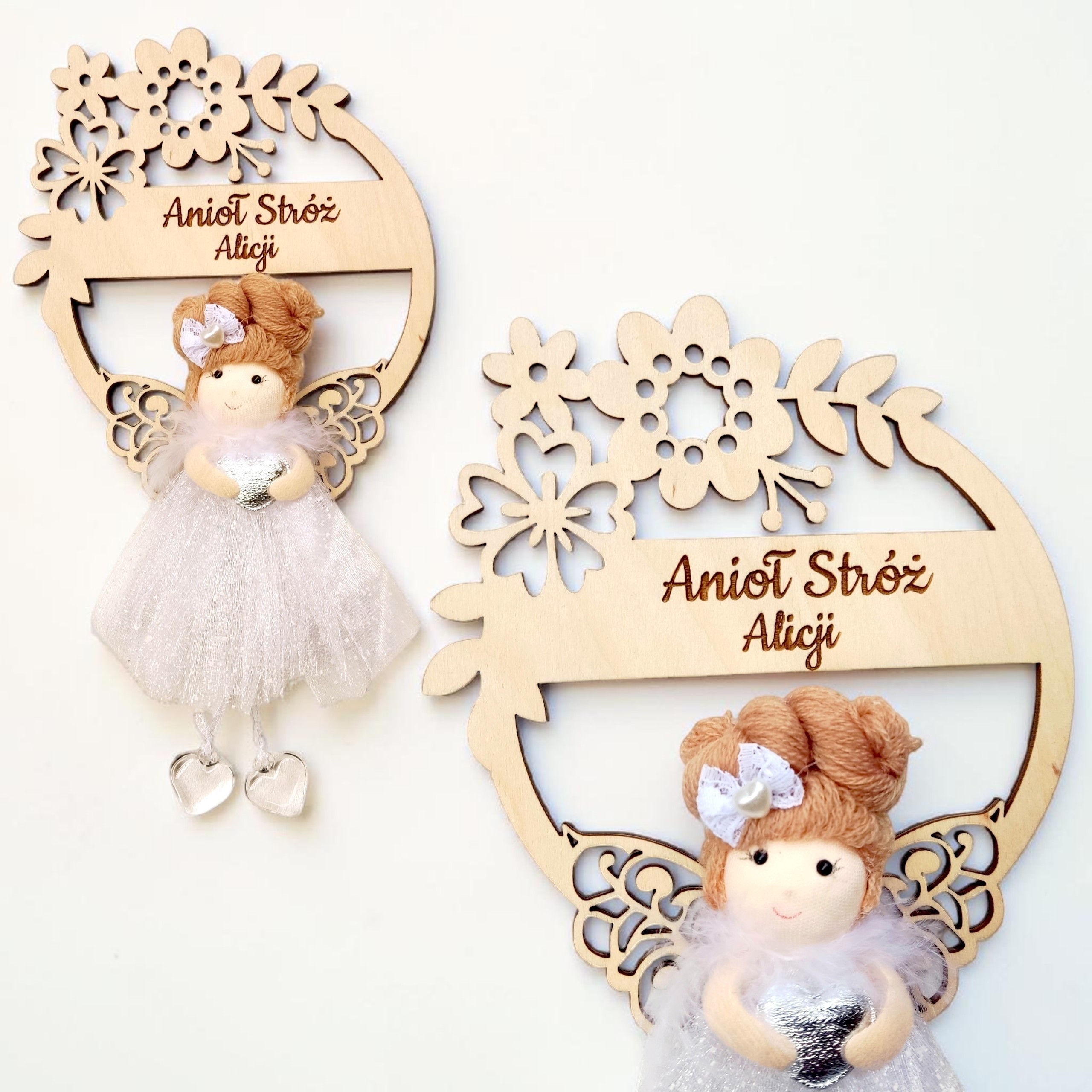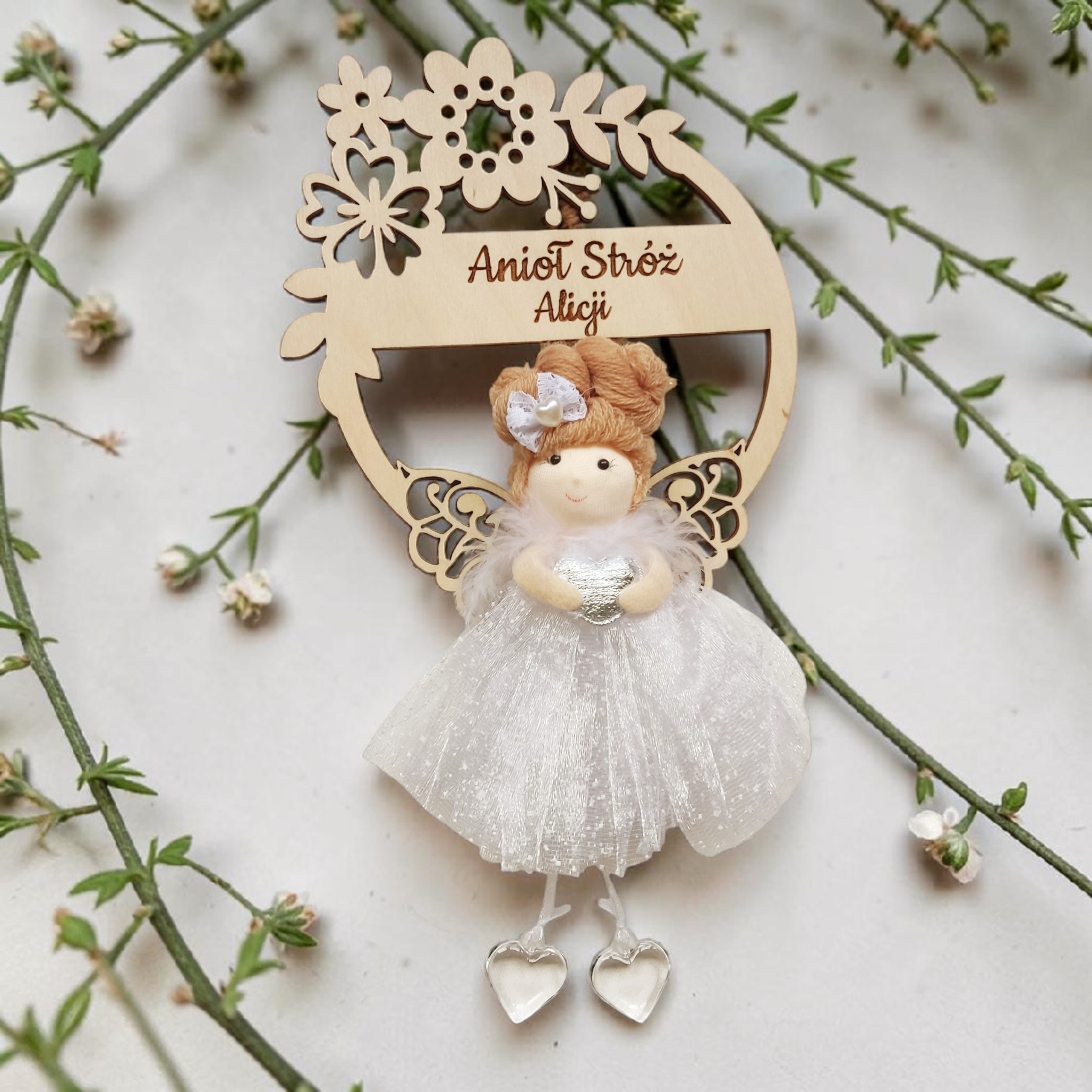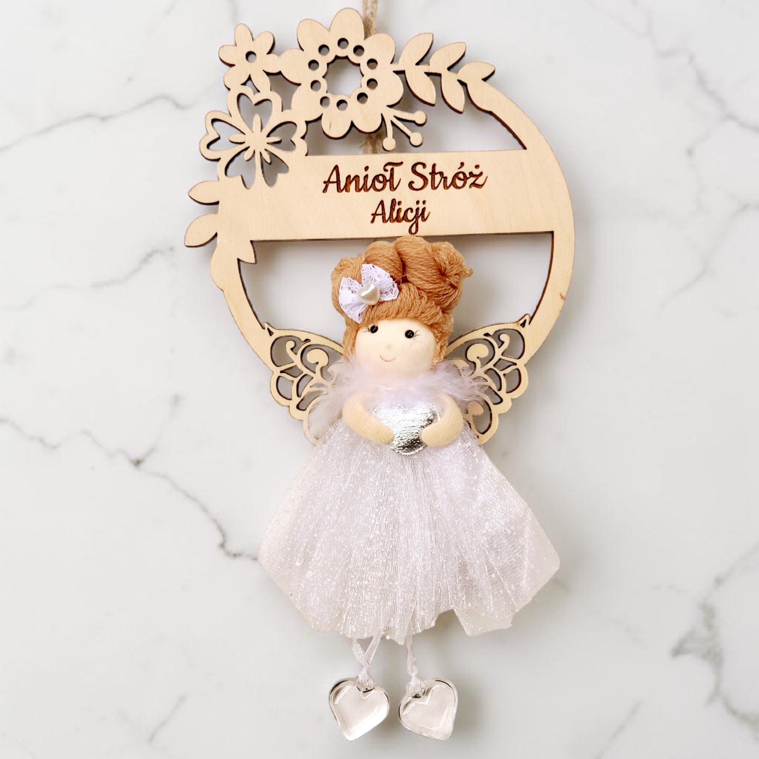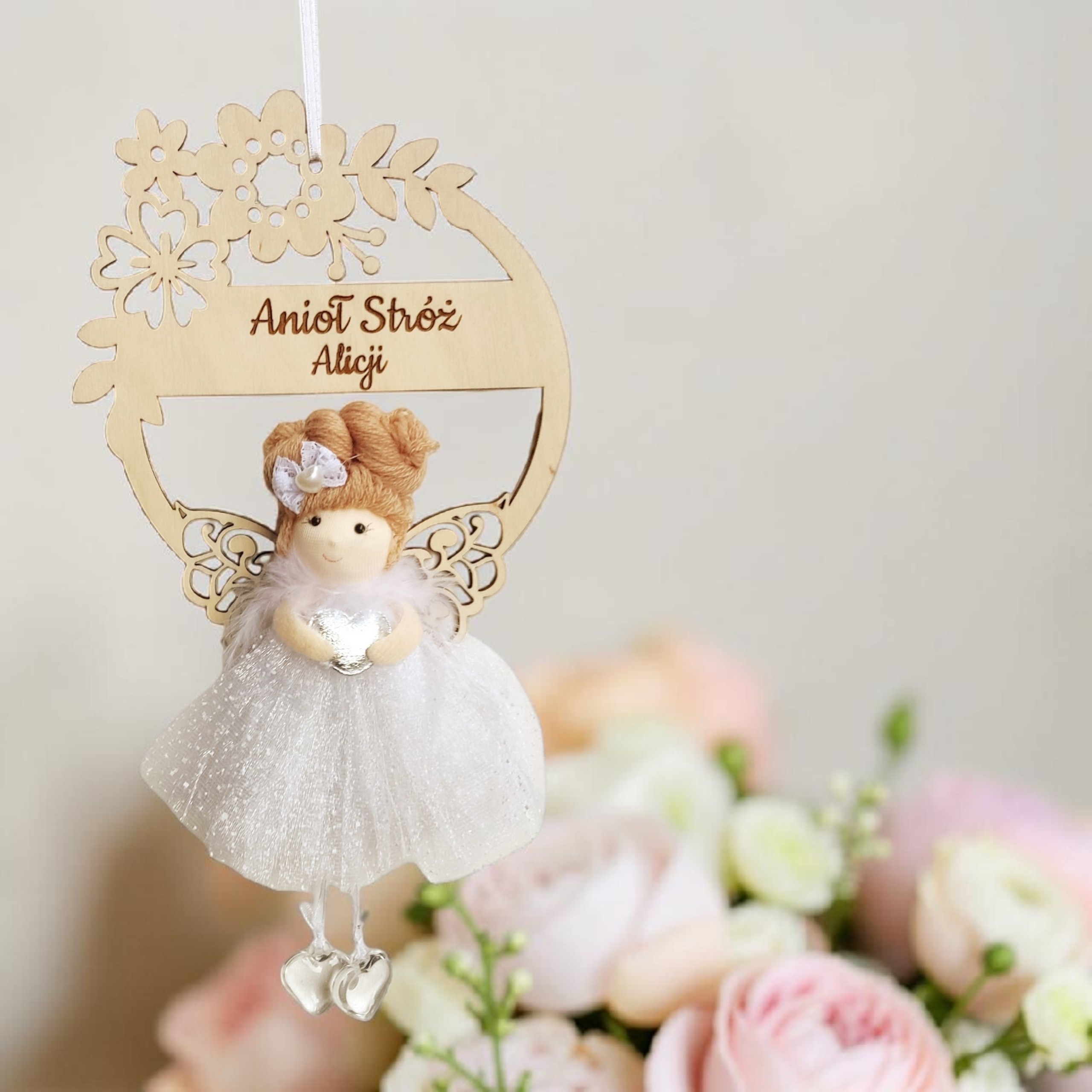 Delikatny aniołek w eleganckiej, tiulowej sukience został umieszczony na ozdobnym wianku kwiatowym, starannie wyciętym ze sklejki. Całość tworzy subtelną i niezwykle estetyczną kompozycję, która doskonale sprawdzi się jako dekoracja pokoju dziecięcego oraz sentymentalna pamiątka na lata.
